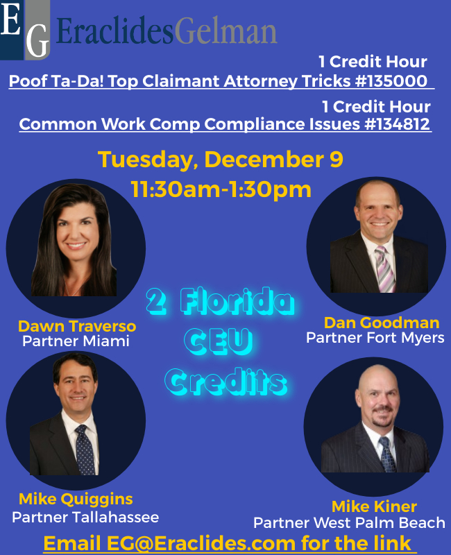 Tuesday, December 9 11:30am-1:30pm 2 Florida credit hours Two for Tuesday-Poof Ta Da! Top Claimant Attorney Tricks-#135000 & Common WC Compliance Issues #134812