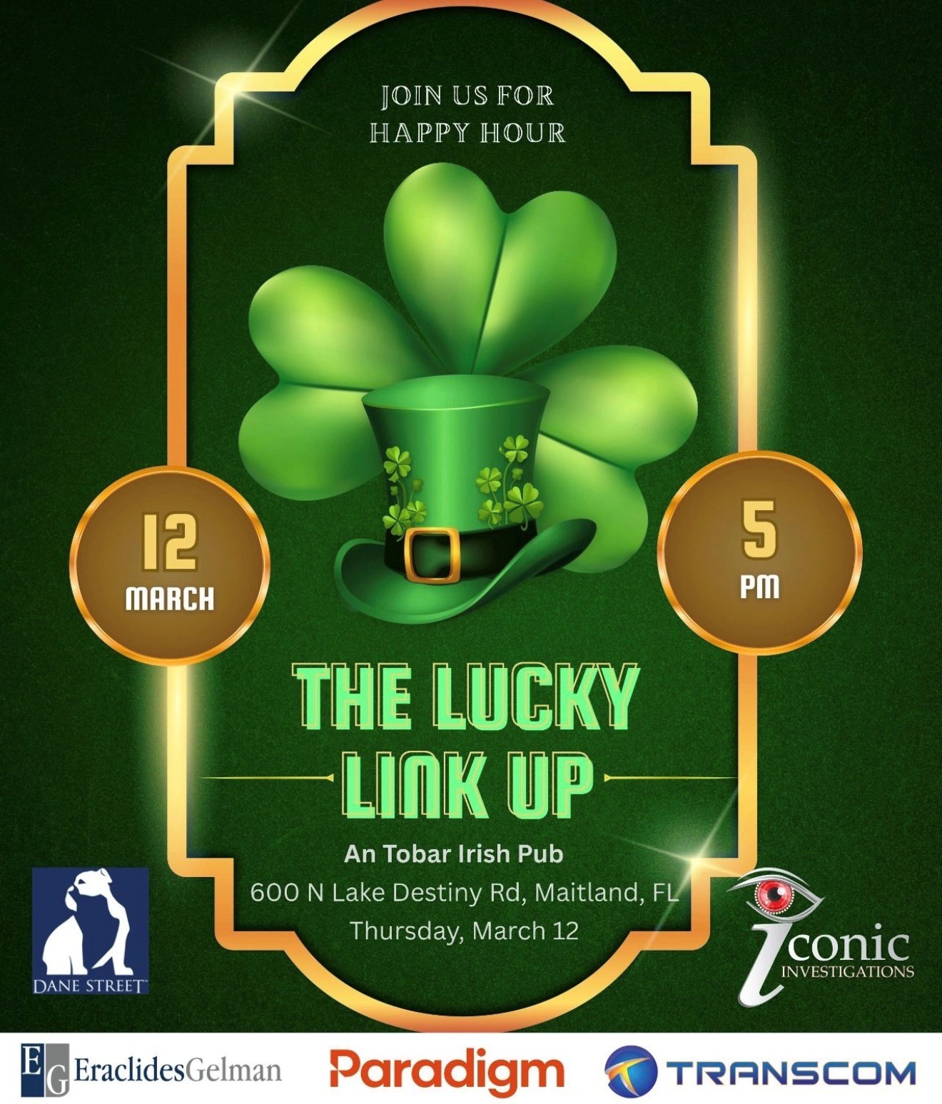Thursday, March 12 5PM An Tobar Irish Pub 600 N Lake Destiny Road Maitland