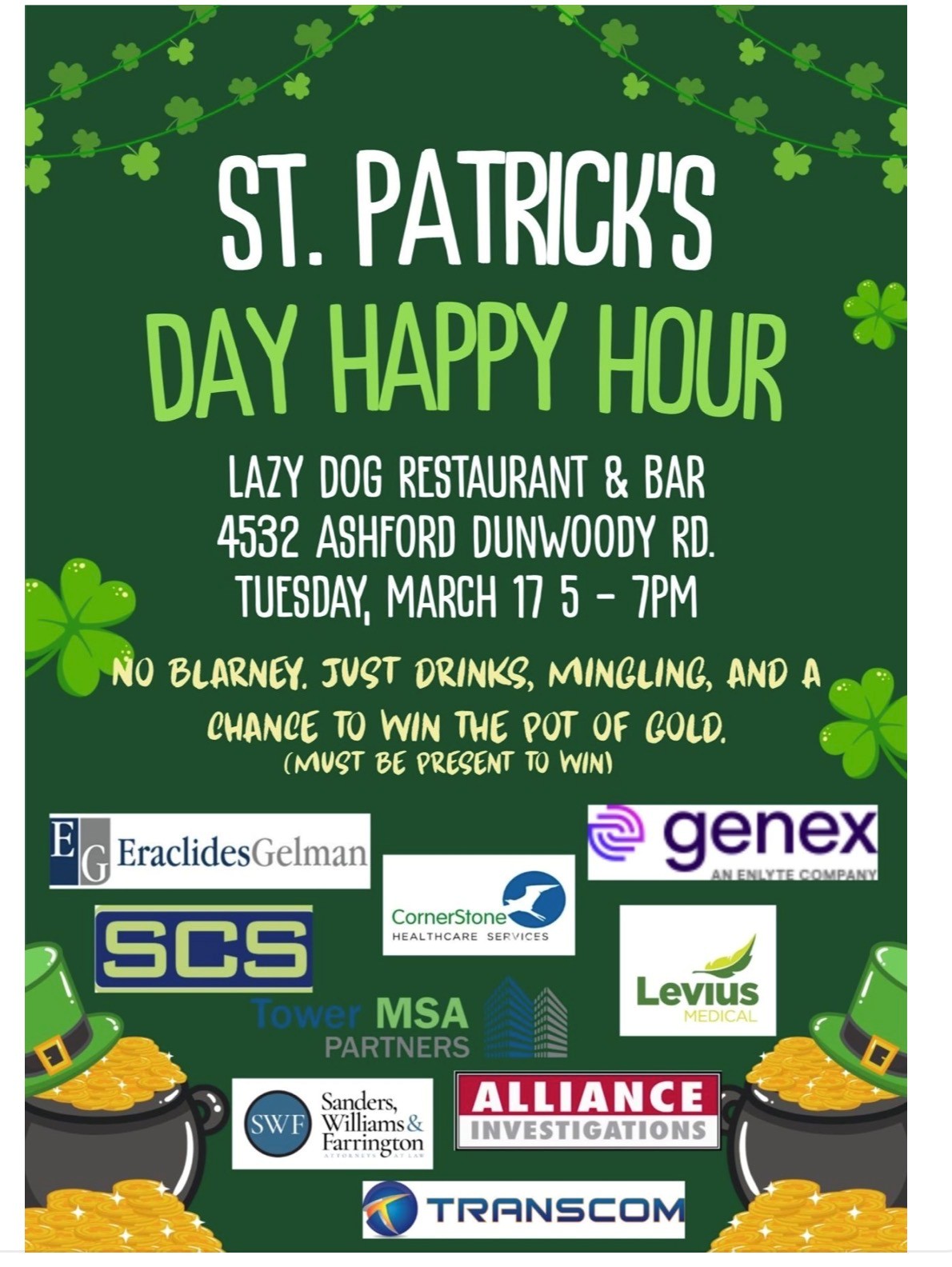 Tuesday, March 17 5:00pm-7:00pm 4532 Ashford Dunwoody Road Lazy Dog Restaurant and Bar