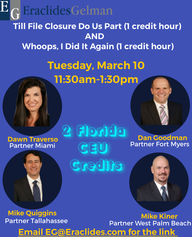 Join us at the Orlando office for food, refreshments and credits! Thursday, February 26 5:00pm 1551 Sandspur Road Suite 200 Maitland 32751 RSVP to EG@Eraclides.com |